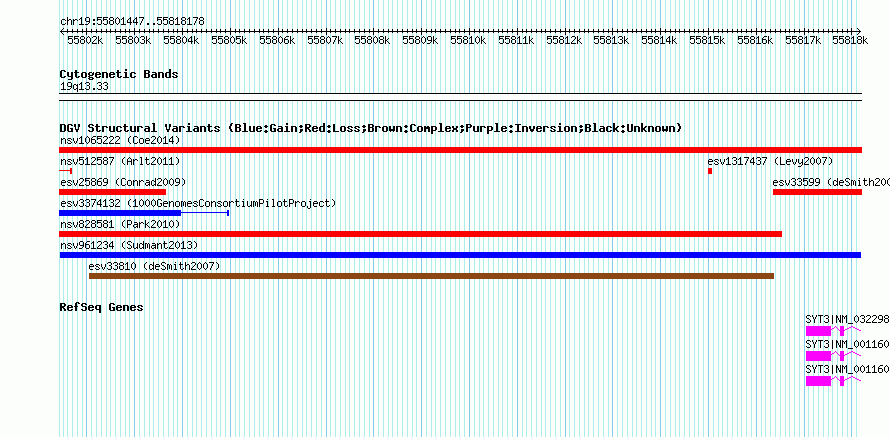 Variant DetailsVariant: nsv961234| Internal ID | 18596480 | | Landmark | | | Location Information | | | Cytoband | 19q13.33 | | Allele length | | Assembly | Allele length | | hg38 | 16732 | | hg19 | 16732 | | hg18 | 16732 |