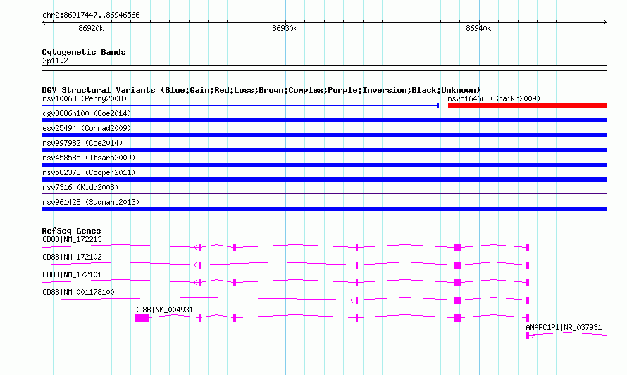 Variant DetailsVariant: nsv961428| Internal ID | 18596674 | | Landmark | | | Location Information | | | Cytoband | 2p11.2 | | Allele length | | Assembly | Allele length | | hg38 | 29120 | | hg19 | 29120 | | hg18 | 29120 |