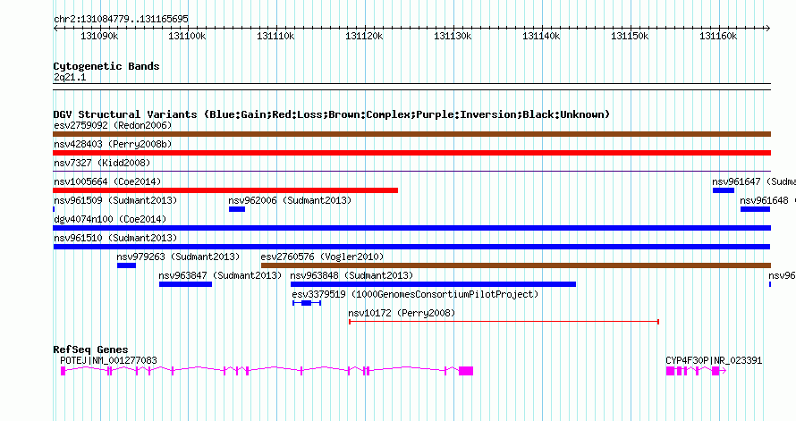 Variant DetailsVariant: nsv961510| Internal ID | 18596756 | | Landmark | | | Location Information | | | Cytoband | 2q21.1 | | Allele length | | Assembly | Allele length | | hg38 | 80917 | | hg19 | 80917 | | hg18 | 80917 |