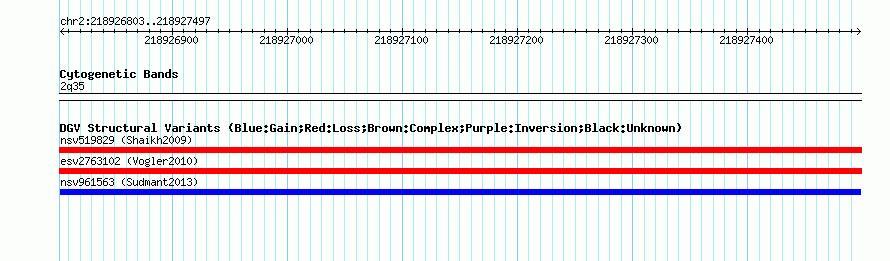 Variant DetailsVariant: nsv961563| Internal ID | 18596809 | | Landmark | | | Location Information | | | Cytoband | 2q35 | | Allele length | | Assembly | Allele length | | hg38 | 695 | | hg19 | 695 | | hg18 | 695 |