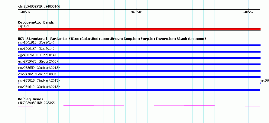 Variant DetailsVariant: nsv961612| Internal ID | 18596858 | | Landmark | | | Location Information | | | Cytoband | 2q11.1 | | Allele length | | Assembly | Allele length | | hg38 | 2168 | | hg19 | 2168 | | hg18 | 2168 |