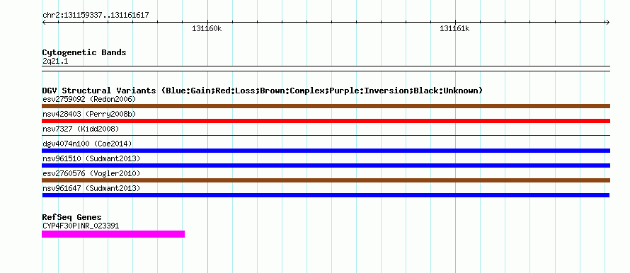 Variant DetailsVariant: nsv961647| Internal ID | 18596893 | | Landmark | | | Location Information | | | Cytoband | 2q21.1 | | Allele length | | Assembly | Allele length | | hg38 | 2281 | | hg19 | 2281 | | hg18 | 2281 |