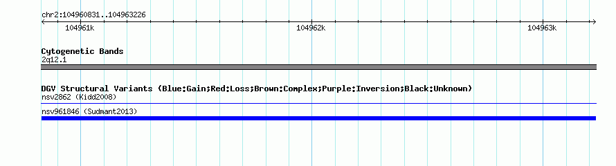 Variant DetailsVariant: nsv961846| Internal ID | 18250406 | | Landmark | | | Location Information | | | Cytoband | 2q12.1 | | Allele length | | Assembly | Allele length | | hg38 | 2396 | | hg19 | 2396 | | hg18 | 2396 |