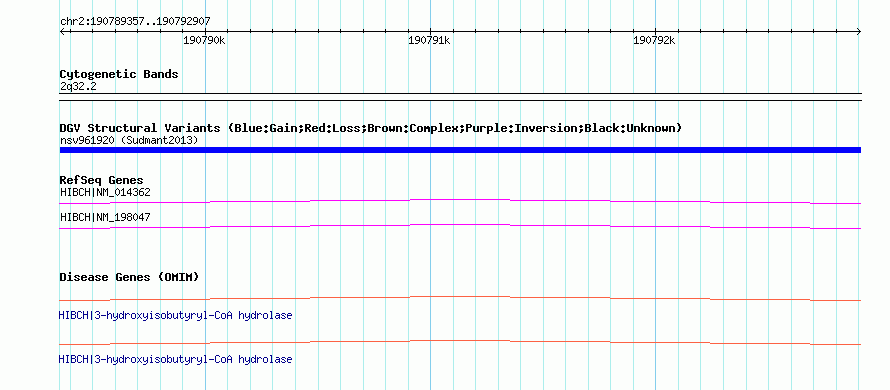 | | Variant Type | CNV duplication | | Copy Number | | | Allele State | | | Allele Origin | | | Probe Count | | | Validation Flag | | | Merged Status | M | | Merged Variants | | | Supporting Variants | nssv2214615, nssv2214617, nssv2214614, nssv2214610, nssv2214618, nssv2214612, nssv2214616, nssv2214619, nssv2214611, nssv2214613 | | Samples | HGDP01284, HGDP00665, HGDP00998, HGDP00521, HGDP00778, HGDP01307, HGDP00542, HGDP01029, HGDP00456, HGDP00927 | | Known Genes | HIBCH | | Method | Sequencing | | Analysis | lineage specific fixed duplications | | Platform | Not reported | | Comments | | | Reference | Sudmant_et_al_2013 | | Pubmed ID | 23825009 | | Accession Number(s) | nsv961920