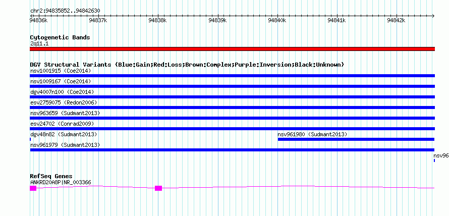 Variant DetailsVariant: nsv961979| Internal ID | 18597225 | | Landmark | | | Location Information | | | Cytoband | 2q11.1 | | Allele length | | Assembly | Allele length | | hg38 | 6779 | | hg19 | 6779 | | hg18 | 6779 |