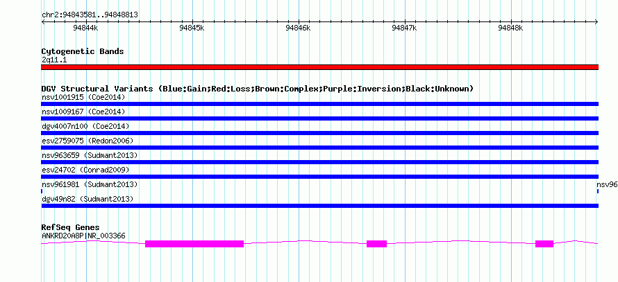 Variant DetailsVariant: nsv961982| Internal ID | 18597228 | | Landmark | | | Location Information | | | Cytoband | 2q11.1 | | Allele length | | Assembly | Allele length | | hg38 | 5233 | | hg19 | 5233 | | hg18 | 5233 |