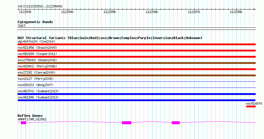 Variant DetailsVariant: nsv961996| Internal ID | 18597242 | | Landmark | | | Location Information | | | Cytoband | 2q13 | | Allele length | | Assembly | Allele length | | hg38 | 5627 | | hg19 | 5627 | | hg18 | 5627 |