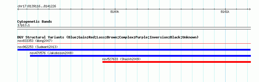 Variant DetailsVariant: nsv962253| Internal ID | 18597497 | | Landmark | | | Location Information | | | Cytoband | 17p13.1 | | Allele length | | Assembly | Allele length | | hg38 | 2111 | | hg19 | 2111 | | hg18 | 2111 |