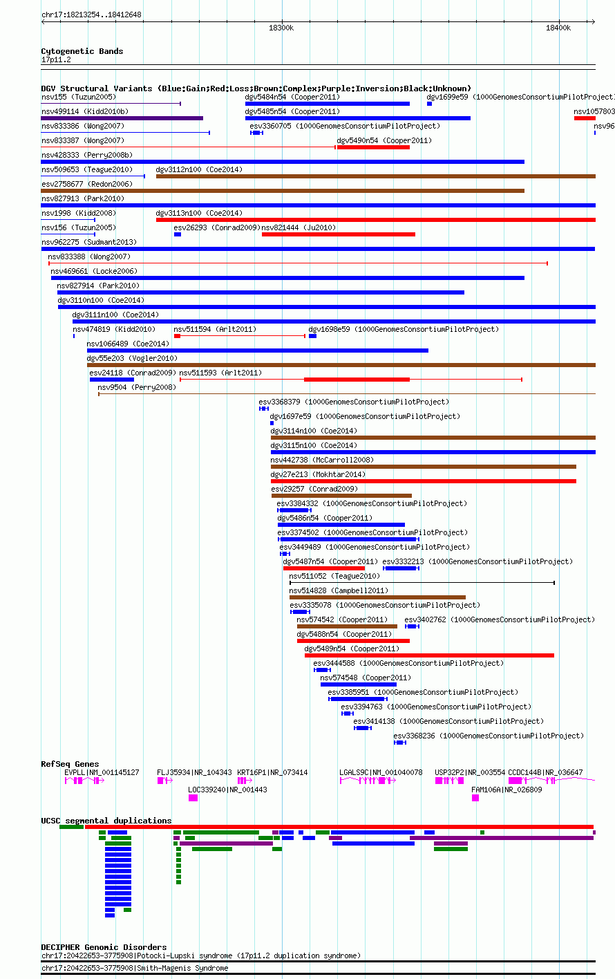 Variant DetailsVariant: nsv962275| Internal ID | 18250833 | | Landmark | | | Location Information | | | Cytoband | 17p11.2 | | Allele length | | Assembly | Allele length | | hg38 | 199395 | | hg19 | 199395 | | hg18 | 199395 |