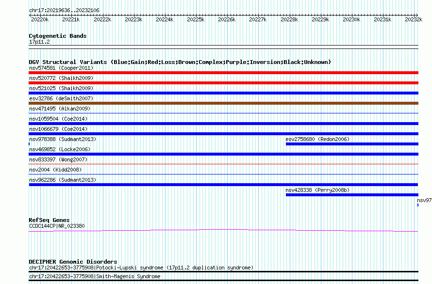 Variant DetailsVariant: nsv962286| Internal ID | 18597530 | | Landmark | | | Location Information | | | Cytoband | 17p11.2 | | Allele length | | Assembly | Allele length | | hg38 | 12471 | | hg19 | 12471 | | hg18 | 12471 |