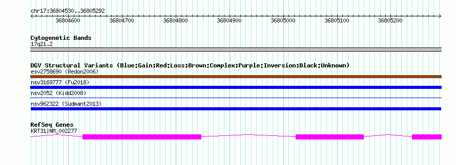 Variant DetailsVariant: nsv962322| Internal ID | 18597566 | | Landmark | | | Location Information | | | Cytoband | 17q21.2 | | Allele length | | Assembly | Allele length | | hg38 | 763 | | hg19 | 763 | | hg18 | 763 |