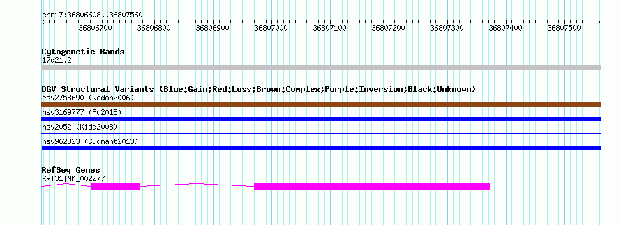 Variant DetailsVariant: nsv962323| Internal ID | 18597567 | | Landmark | | | Location Information | | | Cytoband | 17q21.2 | | Allele length | | Assembly | Allele length | | hg38 | 953 | | hg19 | 953 | | hg18 | 953 |