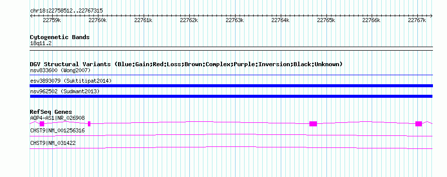 Variant DetailsVariant: nsv962502| Internal ID | 18597745 | | Landmark | | | Location Information | | | Cytoband | 18q11.2 | | Allele length | | Assembly | Allele length | | hg38 | 8804 | | hg19 | 8804 | | hg18 | 8804 |