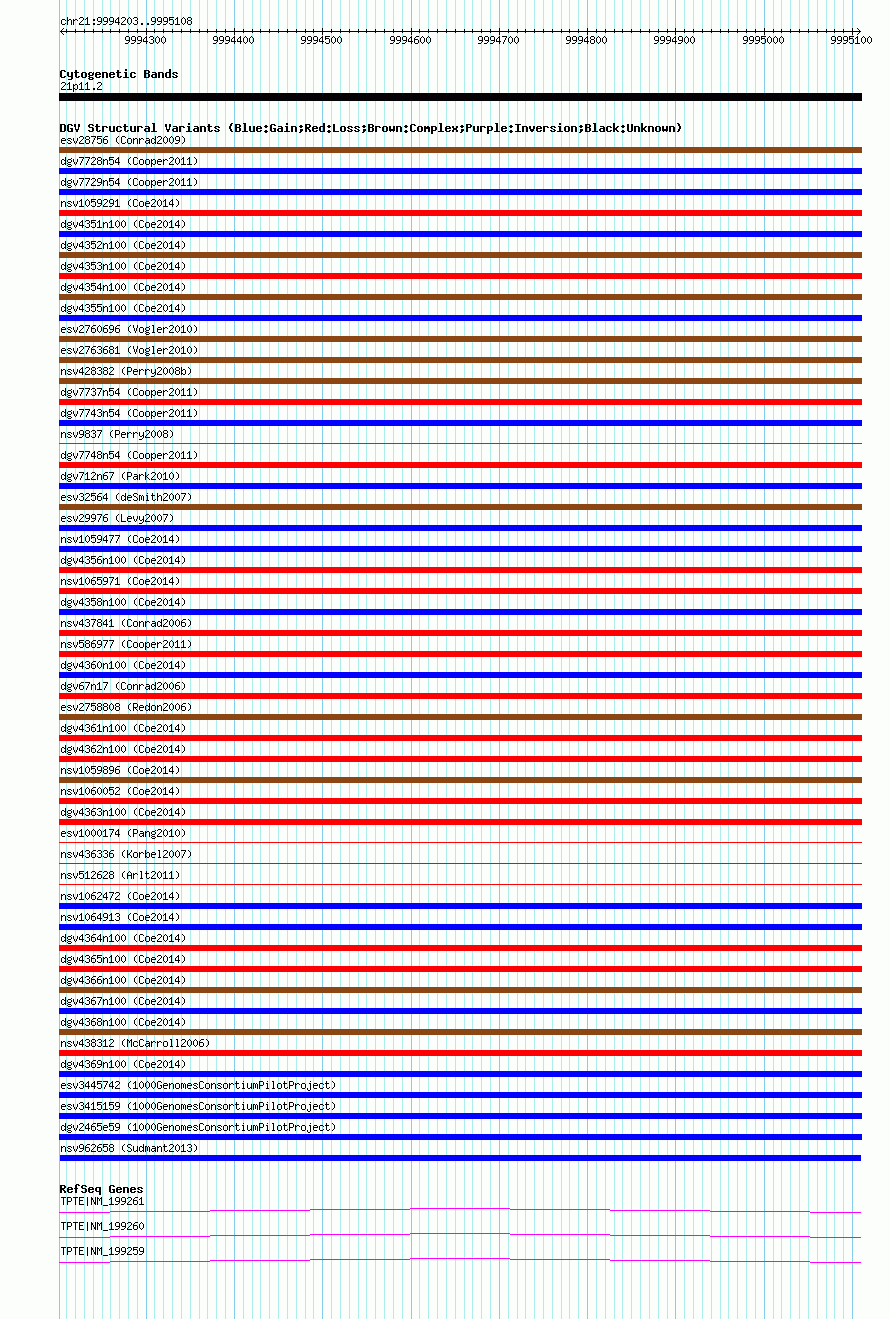 Variant DetailsVariant: nsv962658| Internal ID | 18597901 | | Landmark | | | Location Information | | | Cytoband | 21p11.1 | | Allele length | | Assembly | Allele length | | hg38 | 906 | | hg19 | 906 | | hg18 | 906 |