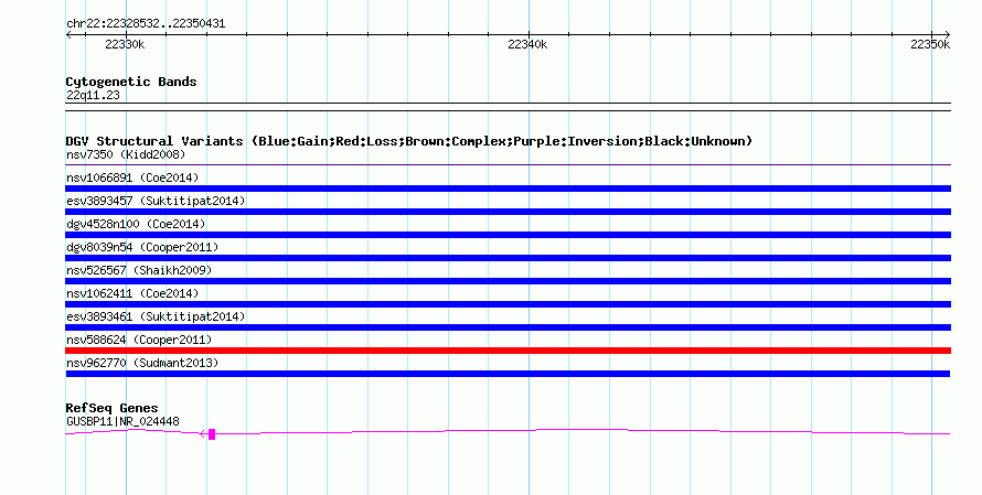 Variant DetailsVariant: nsv962770| Internal ID | 18598012 | | Landmark | | | Location Information | | | Cytoband | 22q11.23 | | Allele length | | Assembly | Allele length | | hg38 | 21900 | | hg19 | 21900 | | hg18 | 21900 |