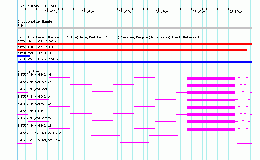 | Variant Type | CNV duplication | Copy Number | | Allele State | | Allele Origin | | Probe Count | | Validation Flag | | Merged Status | M | Merged Variants | | Supporting Variants | nssv2131917, nssv2131926, nssv2131920, nssv2131921, nssv2131923, nssv2131924, nssv2131919, nssv2131922, nssv2131918, nssv2131925 | Samples | HGDP01284, HGDP00665, HGDP00998, HGDP00521, HGDP00778, HGDP01307, HGDP00542, HGDP01029, HGDP00456, HGDP00927 | Known Genes | ZNF559, ZNF559-ZNF177 | Method | Sequencing | Analysis | lineage specific fixed duplications | Platform | Not reported | Comments | | Reference | Sudmant_et_al_2013 | Pubmed ID | 23825009 | Accession Number(s) | nsv963002
