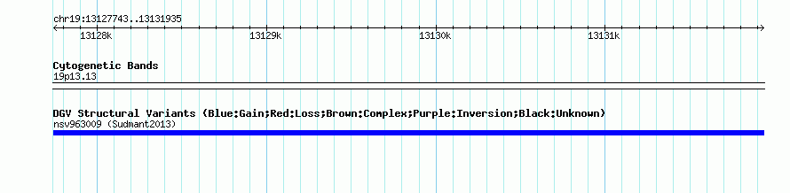 Variant DetailsVariant: nsv963009| Internal ID | 18598251 | | Landmark | | | Location Information | | | Cytoband | 19p13.13 | | Allele length | | Assembly | Allele length | | hg38 | 4193 | | hg19 | 4193 | | hg18 | 4193 |