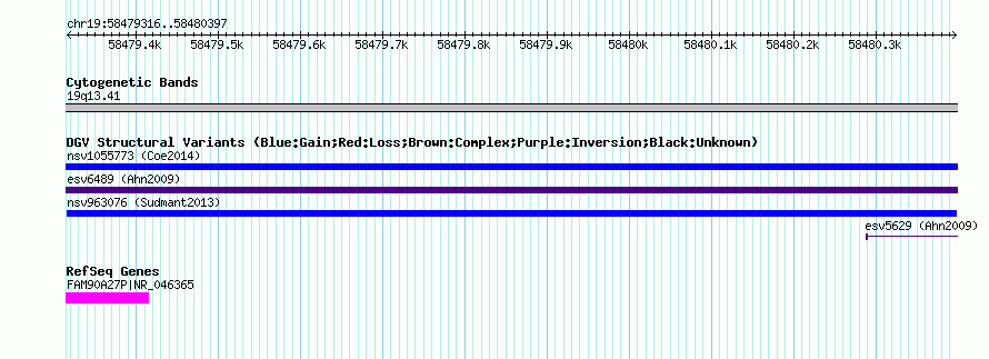 Variant DetailsVariant: nsv963076| Internal ID | 18598318 | | Landmark | | | Location Information | | | Cytoband | 19q13.41 | | Allele length | | Assembly | Allele length | | hg38 | 1082 | | hg19 | 1082 | | hg18 | 1082 |
