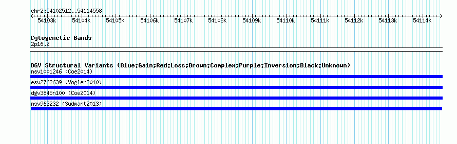 Variant DetailsVariant: nsv963232Internal ID | 18251787 | Landmark | | Location Information | | Cytoband | 2p16.2 | Allele length | Assembly | Allele length | hg38 | 12047 | hg19 | 12047 | hg18 | 12047 |