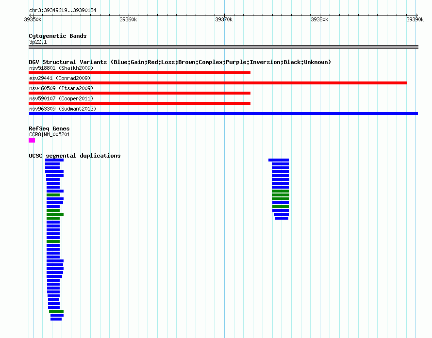 Variant DetailsVariant: nsv963309| Internal ID | 18251864 | | Landmark | | | Location Information | | | Cytoband | 3p22.1 | | Allele length | | Assembly | Allele length | | hg38 | 40566 | | hg19 | 40566 | | hg18 | 40566 |