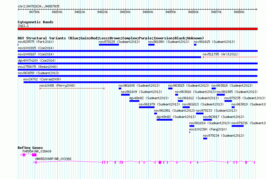 Variant DetailsVariant: nsv963659| Internal ID | 18598899 | | Landmark | | | Location Information | | | Cytoband | 2q11.1 | | Allele length | | Assembly | Allele length | | hg38 | 105172 | | hg19 | 105172 | | hg18 | 105172 |