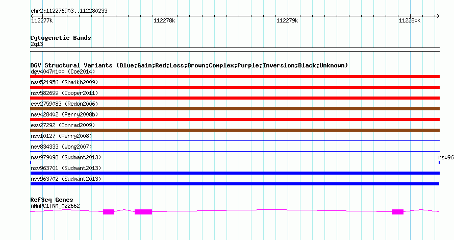 Variant DetailsVariant: nsv963702| Internal ID | 18598942 | | Landmark | | | Location Information | | | Cytoband | 2q13 | | Allele length | | Assembly | Allele length | | hg38 | 3331 | | hg19 | 3331 | | hg18 | 3331 |
