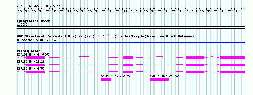 | Variant Type | CNV duplication | Copy Number | | Allele State | | Allele Origin | | Probe Count | | Validation Flag | | Merged Status | M | Merged Variants | | Supporting Variants | nssv2219412, nssv2219405, nssv2219406, nssv2219407, nssv2219413, nssv2219410, nssv2219408, nssv2219414, nssv2219409, nssv2219411 | Samples | HGDP01284, HGDP00665, HGDP00998, HGDP00521, HGDP00778, HGDP01307, HGDP00542, HGDP01029, HGDP00456, HGDP00927 | Known Genes | EEF1B2, SNORA41, SNORD51 | Method | Sequencing | Analysis | lineage specific fixed duplications | Platform | Not reported | Comments | | Reference | Sudmant_et_al_2013 | Pubmed ID | 23825009 | Accession Number(s) | nsv963768