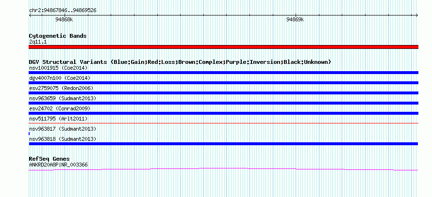 Variant DetailsVariant: nsv963818| Internal ID | 18599058 | | Landmark | | | Location Information | | | Cytoband | 2q11.1 | | Allele length | | Assembly | Allele length | | hg38 | 1681 | | hg19 | 1681 | | hg18 | 1681 |