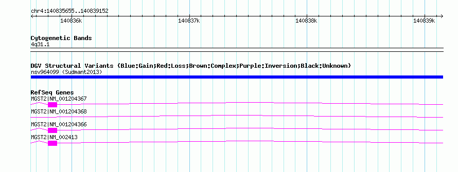 Variant DetailsVariant: nsv964099| Internal ID | 18599337 | | Landmark | | | Location Information | | | Cytoband | 4q31.1 | | Allele length | | Assembly | Allele length | | hg38 | 3498 | | hg19 | 3498 | | hg18 | 3498 |