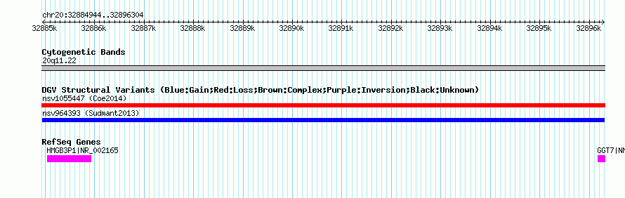 Variant DetailsVariant: nsv964393| Internal ID | 18599631 | | Landmark | | | Location Information | | | Cytoband | 20q11.22 | | Allele length | | Assembly | Allele length | | hg38 | 11361 | | hg19 | 11361 | | hg18 | 11361 |
