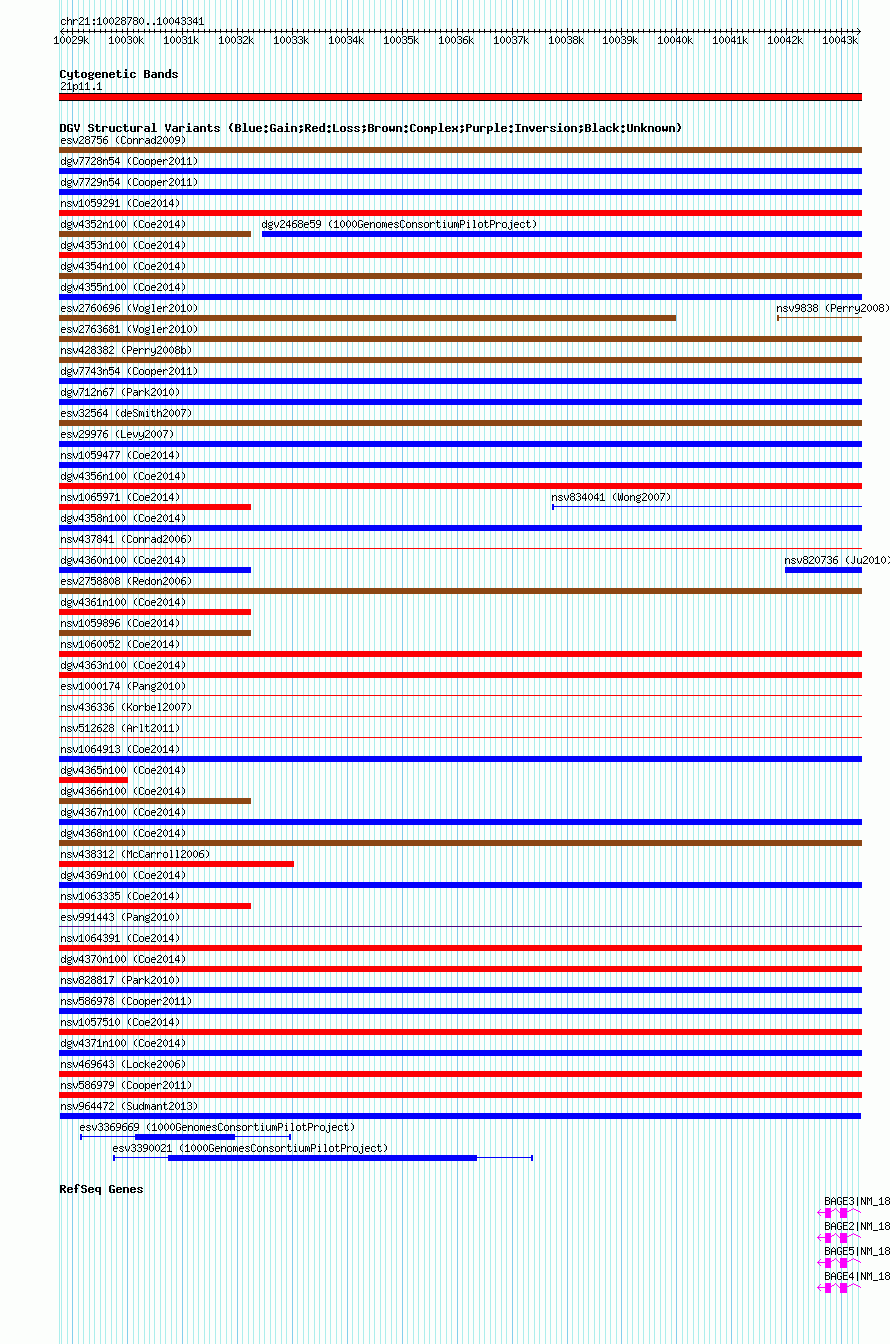 | | Variant Type | CNV duplication | | Copy Number | | | Allele State | | | Allele Origin | | | Probe Count | | | Validation Flag | | | Merged Status | M | | Merged Variants | | | Supporting Variants | nssv2242011, nssv2242012, nssv2242018, nssv2242014, nssv2242016, nssv2242015, nssv2242019, nssv2242017, nssv2242020, nssv2242013 | | Samples | HGDP01284, HGDP00665, HGDP00998, HGDP00521, HGDP00778, HGDP01307, HGDP00542, HGDP01029, HGDP00456, HGDP00927 | | Known Genes | BAGE2, BAGE3, BAGE4, BAGE5 | | Method | Sequencing | | Analysis | lineage specific fixed duplications | | Platform | Not reported | | Comments | | | Reference | Sudmant_et_al_2013 | | Pubmed ID | 23825009 | | Accession Number(s) | nsv964472