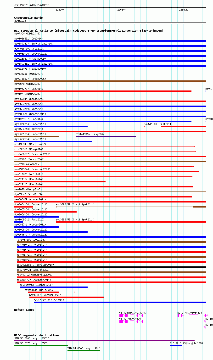 | | Variant Type | CNV duplication | | Copy Number | | | Allele State | | | Allele Origin | | | Probe Count | | | Validation Flag | | | Merged Status | M | | Merged Variants | | | Supporting Variants | nssv2261134, nssv2261133, nssv2261130, nssv2261126, nssv2261127, nssv2261135, nssv2261131, nssv2261132, nssv2261129, nssv2261128 | | Samples | HGDP01284, HGDP00665, HGDP00998, HGDP00521, HGDP00778, HGDP01307, HGDP00542, HGDP01029, HGDP00456, HGDP00927 | | Known Genes | DDT, DDTL, GSTT2, GSTT2B | | Method | Sequencing | | Analysis | lineage specific fixed duplications | | Platform | Not reported | | Comments | | | Reference | Sudmant_et_al_2013 | | Pubmed ID | 23825009 | | Accession Number(s) | nsv964607