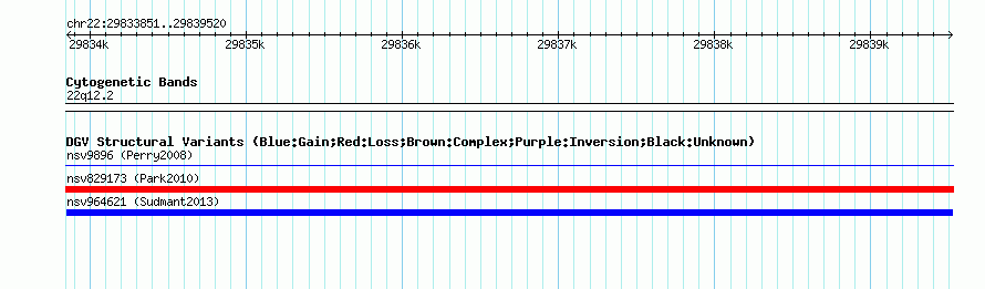 Variant DetailsVariant: nsv964621| Internal ID | 18599858 | | Landmark | | | Location Information | | | Cytoband | 22q12.2 | | Allele length | | Assembly | Allele length | | hg38 | 5670 | | hg19 | 5670 | | hg18 | 5670 |