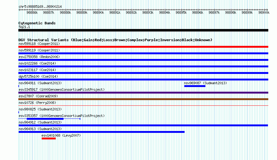 Variant DetailsVariant: nsv964912| Internal ID | 18600148 | | Landmark | | | Location Information | | | Cytoband | 5q21.1 | | Allele length | | Assembly | Allele length | | hg38 | 15046 | | hg19 | 15046 | | hg18 | 15046 |