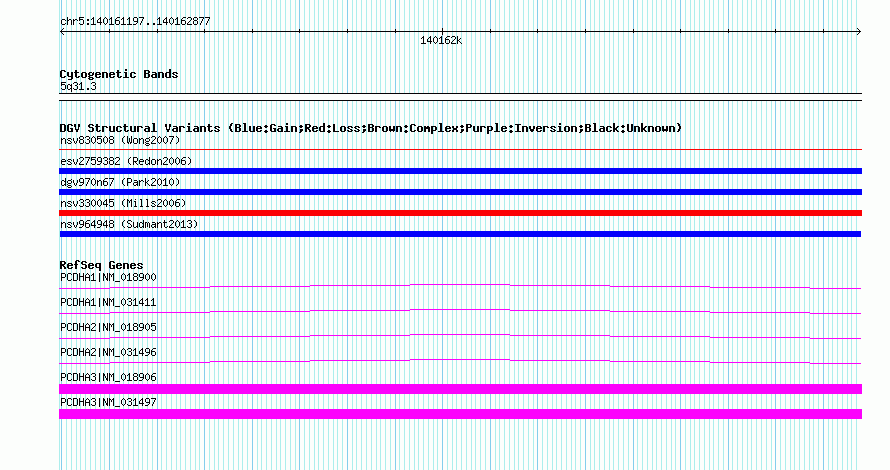 | | Variant Type | CNV duplication | | Copy Number | | | Allele State | | | Allele Origin | | | Probe Count | | | Validation Flag | | | Merged Status | M | | Merged Variants | | | Supporting Variants | nssv2379277, nssv2379281, nssv2379284, nssv2379283, nssv2379275, nssv2379279, nssv2379278, nssv2379282, nssv2379280, nssv2379276 | | Samples | HGDP01284, HGDP00665, HGDP00998, HGDP00521, HGDP00778, HGDP01307, HGDP00542, HGDP01029, HGDP00456, HGDP00927 | | Known Genes | PCDHA1, PCDHA2, PCDHA3 | | Method | Sequencing | | Analysis | lineage specific fixed duplications | | Platform | Not reported | | Comments | | | Reference | Sudmant_et_al_2013 | | Pubmed ID | 23825009 | | Accession Number(s) | nsv964948