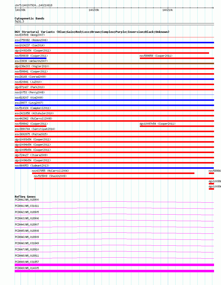 | | Variant Type | CNV duplication | | Copy Number | | | Allele State | | | Allele Origin | | | Probe Count | | | Validation Flag | | | Merged Status | M | | Merged Variants | | | Supporting Variants | nssv2379609, nssv2379608, nssv2379611, nssv2379612, nssv2379614, nssv2379606, nssv2379613, nssv2379605, nssv2379607, nssv2379610 | | Samples | HGDP01284, HGDP00665, HGDP00998, HGDP00521, HGDP00778, HGDP01307, HGDP00542, HGDP01029, HGDP00456, HGDP00927 | | Known Genes | PCDHA1, PCDHA2, PCDHA3, PCDHA4, PCDHA5, PCDHA6, PCDHA7, PCDHA8, PCDHA9 | | Method | Sequencing | | Analysis | lineage specific fixed duplications | | Platform | Not reported | | Comments | | | Reference | Sudmant_et_al_2013 | | Pubmed ID | 23825009 | | Accession Number(s) | nsv964953