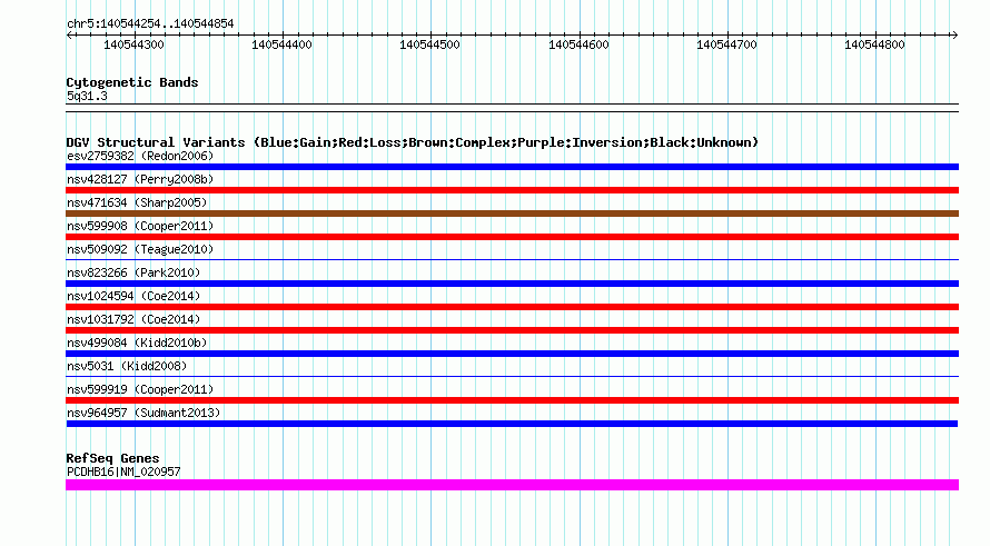 Variant DetailsVariant: nsv964957| Internal ID | 18600192 | | Landmark | | | Location Information | | | Cytoband | 5q31.3 | | Allele length | | Assembly | Allele length | | hg38 | 601 | | hg19 | 601 | | hg18 | 601 |