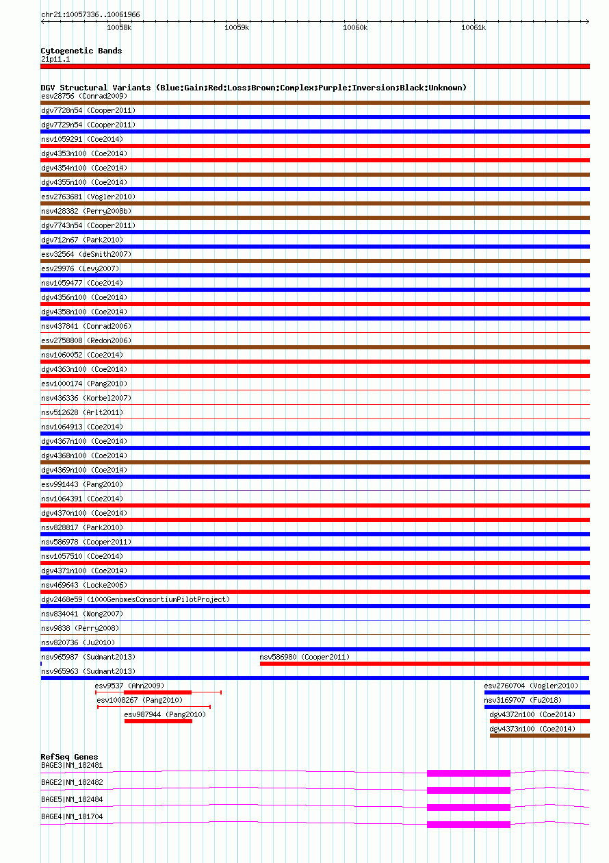 Variant DetailsVariant: nsv965963| Internal ID | 18601193 | | Landmark | | | Location Information | | | Cytoband | 21p11.1 | | Allele length | | Assembly | Allele length | | hg38 | 4631 | | hg19 | 4631 | | hg18 | 4631 |