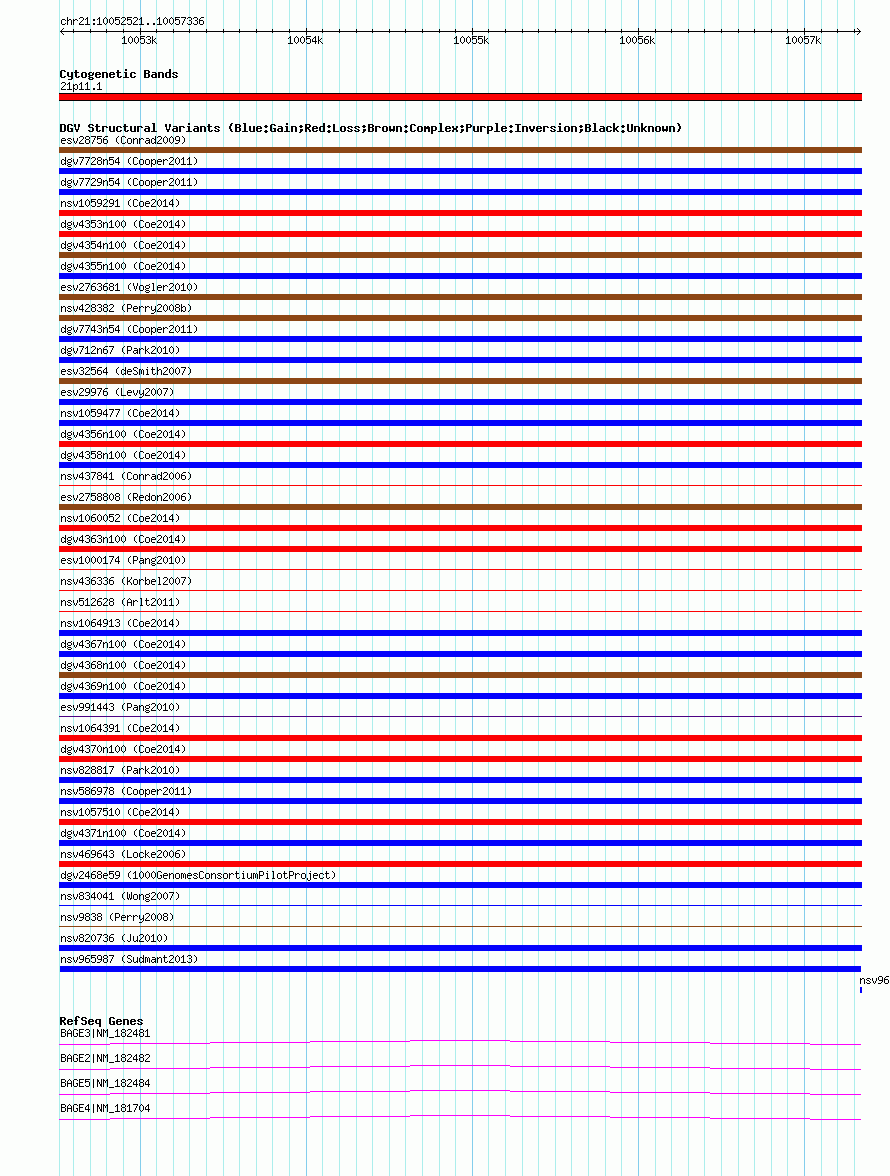 Variant DetailsVariant: nsv965987| Internal ID | 18601217 | | Landmark | | | Location Information | | | Cytoband | 21p11.1 | | Allele length | | Assembly | Allele length | | hg38 | 4816 | | hg19 | 4816 | | hg18 | 4816 |