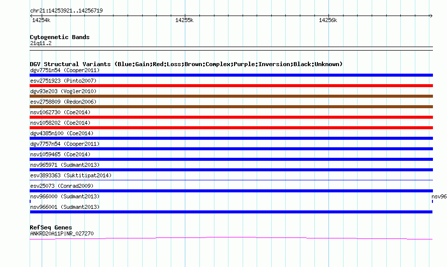 Variant DetailsVariant: nsv966001| Internal ID | 18601231 | | Landmark | | | Location Information | | | Cytoband | 21q11.2 | | Allele length | | Assembly | Allele length | | hg38 | 2799 | | hg19 | 2799 | | hg18 | 2799 |