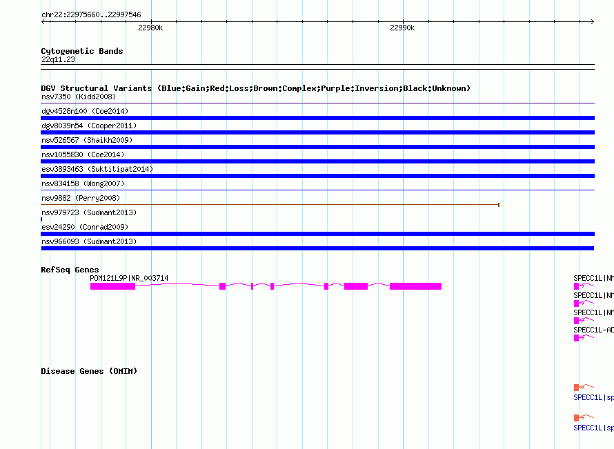 Variant DetailsVariant: nsv966093| Internal ID | 18601323 | | Landmark | | | Location Information | | | Cytoband | 22q11.23 | | Allele length | | Assembly | Allele length | | hg38 | 21887 | | hg19 | 21887 | | hg18 | 21887 |