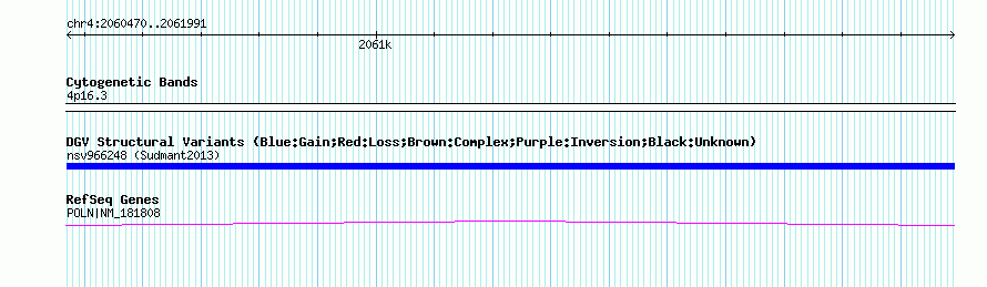 Variant DetailsVariant: nsv966248| Internal ID | 18601478 | | Landmark | | | Location Information | | | Cytoband | 4p16.3 | | Allele length | | Assembly | Allele length | | hg38 | 1522 | | hg19 | 1522 | | hg18 | 1522 |