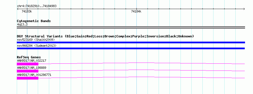 Variant DetailsVariant: nsv966284| Internal ID | 18601514 | | Landmark | | | Location Information | | | Cytoband | 4q13.3 | | Allele length | | Assembly | Allele length | | hg38 | 2074 | | hg19 | 2074 | | hg18 | 2074 |