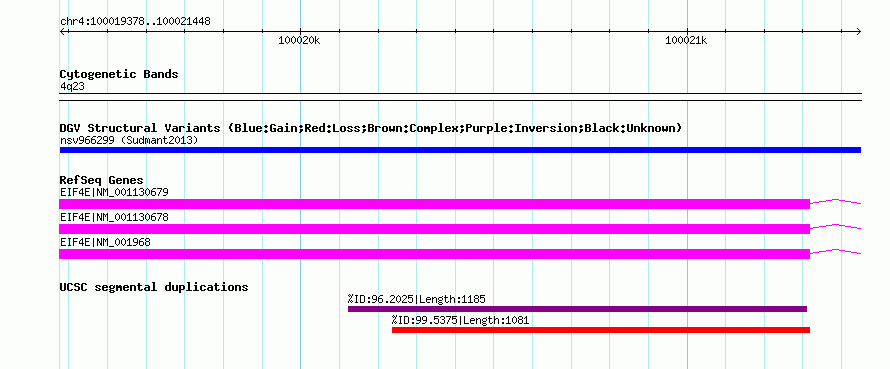 | | Variant Type | CNV duplication | | Copy Number | | | Allele State | | | Allele Origin | | | Probe Count | | | Validation Flag | | | Merged Status | M | | Merged Variants | | | Supporting Variants | nssv2326892, nssv2326887, nssv2326889, nssv2326893, nssv2326895, nssv2326891, nssv2326894, nssv2326888, nssv2326890, nssv2326886 | | Samples | HGDP01284, HGDP00665, HGDP00998, HGDP00521, HGDP00778, HGDP01307, HGDP00542, HGDP01029, HGDP00456, HGDP00927 | | Known Genes | EIF4E | | Method | Sequencing | | Analysis | lineage specific fixed duplications | | Platform | Not reported | | Comments | | | Reference | Sudmant_et_al_2013 | | Pubmed ID | 23825009 | | Accession Number(s) | nsv966299