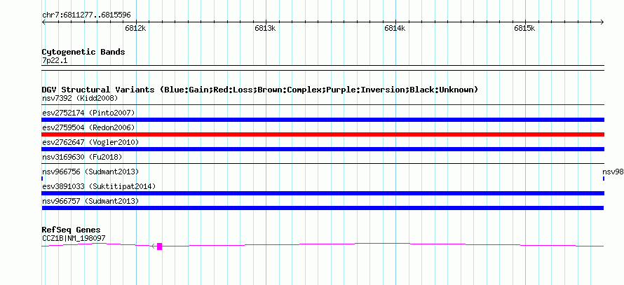 Variant DetailsVariant: nsv966757| Internal ID | 18601987 | | Landmark | | | Location Information | | | Cytoband | 7p22.1 | | Allele length | | Assembly | Allele length | | hg38 | 4320 | | hg19 | 4320 | | hg18 | 4320 |
