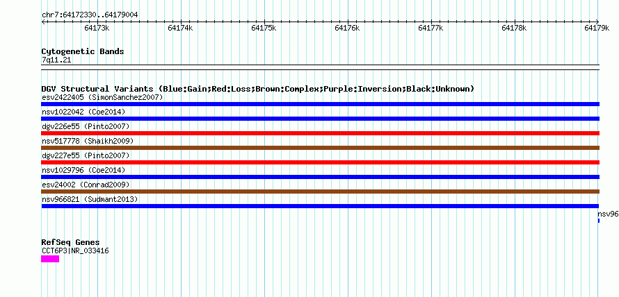 Variant DetailsVariant: nsv966821| Internal ID | 18602051 | | Landmark | | | Location Information | | | Cytoband | 7q11.21 | | Allele length | | Assembly | Allele length | | hg38 | 6675 | | hg19 | 6675 | | hg18 | 6675 |