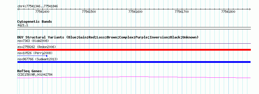 Variant DetailsVariant: nsv967766| Internal ID | 18602994 | | Landmark | | | Location Information | | | Cytoband | 4q21.1 | | Allele length | | Assembly | Allele length | | hg38 | 501 | | hg19 | 501 | | hg18 | 501 |