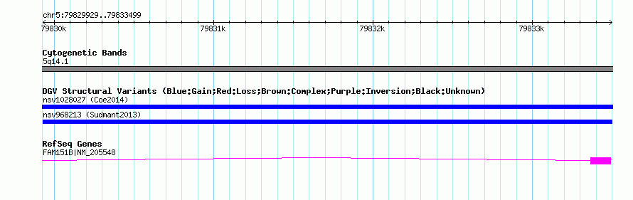 Variant DetailsVariant: nsv968213| Internal ID | 18603441 | | Landmark | | | Location Information | | | Cytoband | 5q14.1 | | Allele length | | Assembly | Allele length | | hg38 | 3571 | | hg19 | 3571 | | hg18 | 3571 |