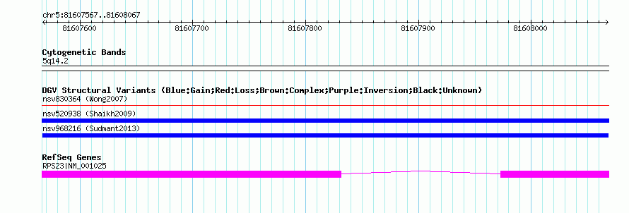 Variant DetailsVariant: nsv968216| Internal ID | 18603444 | | Landmark | | | Location Information | | | Cytoband | 5q14.2 | | Allele length | | Assembly | Allele length | | hg38 | 501 | | hg19 | 501 | | hg18 | 501 |