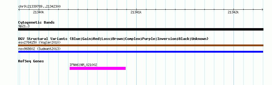 Variant DetailsVariant: nsv968602| Internal ID | 18603830 | | Landmark | | | Location Information | | | Cytoband | 9p21.3 | | Allele length | | Assembly | Allele length | | hg38 | 2512 | | hg19 | 2512 | | hg18 | 2512 |